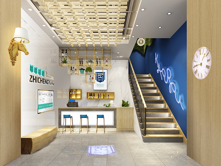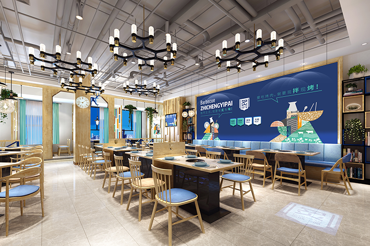 2、整體色調:整體色調統一在主色調海藍,天空和大海都是藍色的,所以藍色也給人廣闊、沉靜的感覺。同時藍色也代表著信任與忠誠,藍色可以激發消費者的忠誠情緒。科學研究表明:主色調為藍色的店鋪比其他藍色的店鋪吸引的老顧客多約15%,炙成一派烤肉餐廳采用天空藍的藍色系,與我們傳達的新鮮,干凈、現拌的出品特質完美契合,使用藍色刻意營造舒適,純凈的用餐氛圍。