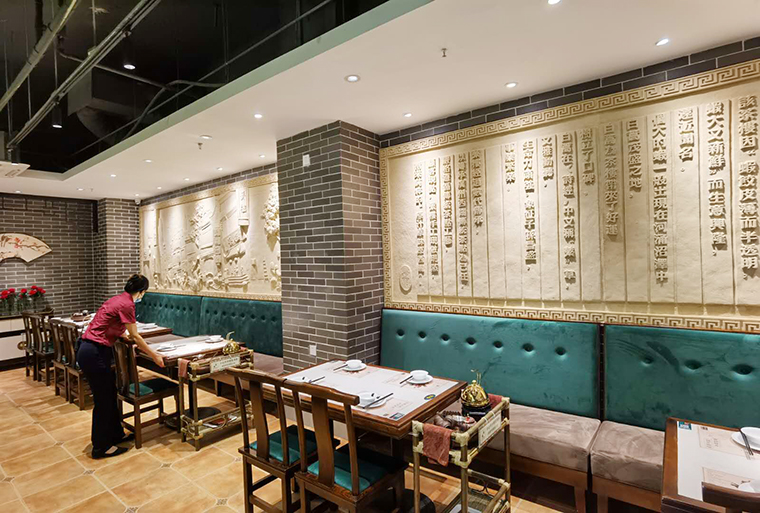 空間中我們則用西關常見的騎樓、灰磚、鑊耳山墻、趟門,把百年傳承的文化韻味裝飾出來,讓消費者身臨其境,感受蘩樓的西關點心文化。這是把