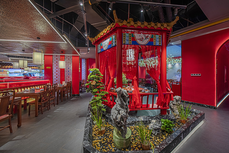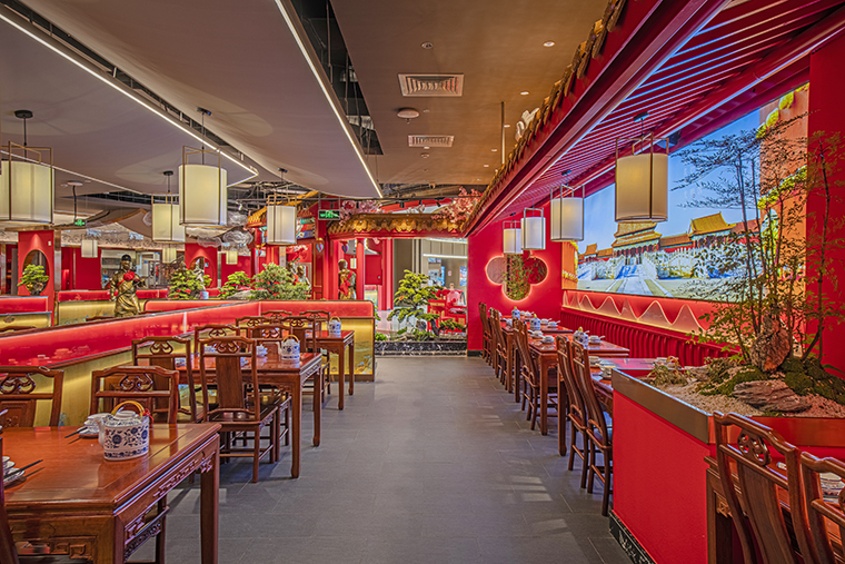 餐廳的地面材料使用的是灰色仿古磚,仿老北京四合院地面灰磚,防滑耐臟,易打理。立面大量使用故宮紅色基底漆涂料,顏色鮮明,極具北京故宮特色;