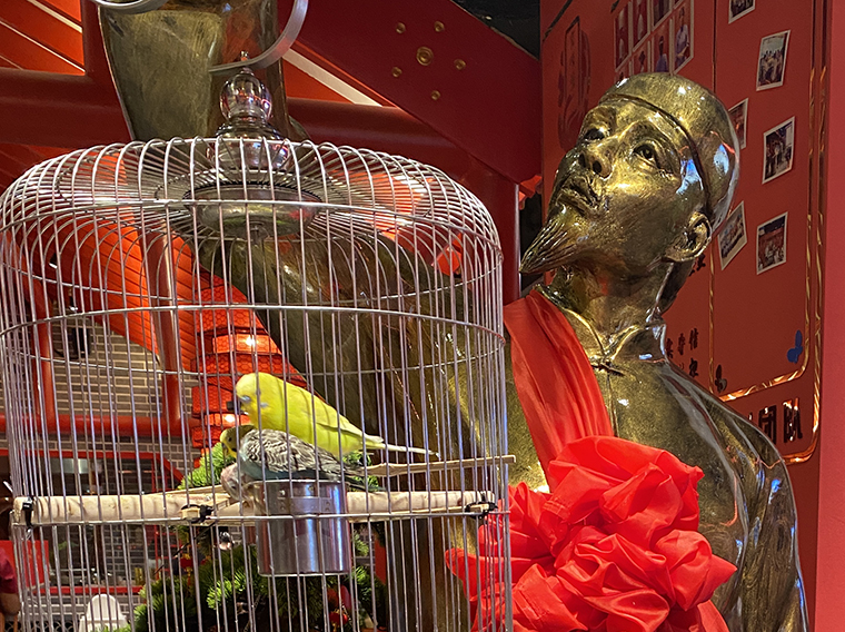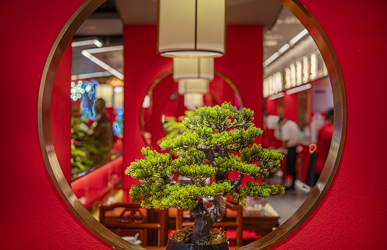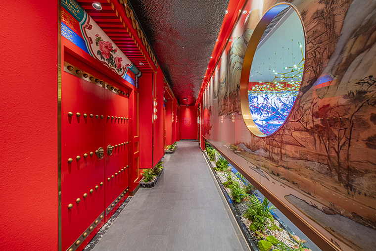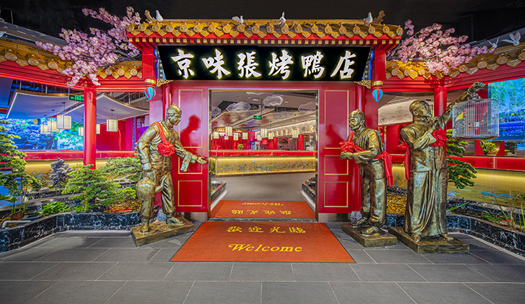 京味張的空間裝飾設(shè)計(jì)大量借鑒了中式園林造景手法,一步一小景、三步一大景,步移景異。用中國(guó)紅強(qiáng)化品牌內(nèi)含的北京皇城文化,令人印象鮮明;門口的迎賓人,提籠遛鳥人,跑堂人等雕塑銅人將老北京烤鴨飲食文化自然帶出;中式園林造景手法,點(diǎn)綴綠植,水景,框景,步移景異;天花的不銹鋼波紋板,一朵朵的祥云裝飾;矮隔斷的千里江山中國(guó)山水工筆畫造型裝飾,仿佛流動(dòng)的山水國(guó)畫;立面的水晶玻璃磚,暗藏?zé)魩У牟AЦ魯?,空間中各種不銹鋼收邊條,明檔上的不銹鋼背發(fā)光字,現(xiàn)代裝飾材料與經(jīng)典美食交相輝映,經(jīng)典不失時(shí)尚。