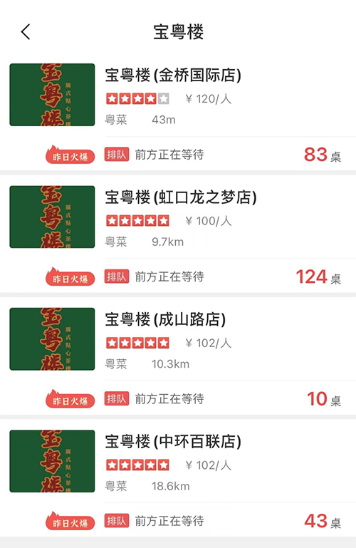 寶粵樓在2020年6月份首家店(成山路1339號大華優嘉2樓)開業之后,品牌勢能非常強大,在不到一年的時間內,迅速開出了4家店。分別是百聯中環店(真光路1288號百聯中環購物廣場4樓)、虹口龍之夢店(西江灣路388號凱德龍之夢-A棟6樓)、金橋國際廣場店(張揚路361弄金橋國際商業廣場-7座3樓)每個店都是所在商場的排隊王,流量明星,人氣爆滿,極速成為了上海粵菜點心品類的頭部品牌。
