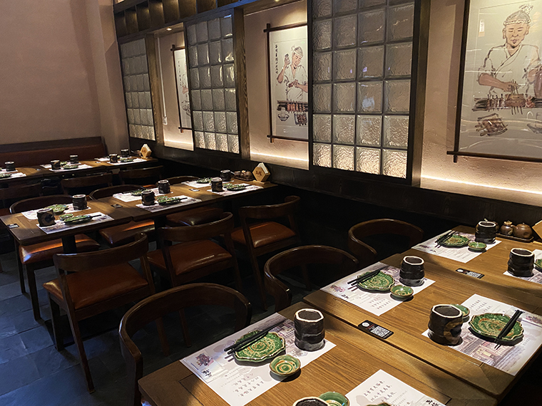 最能體現(xiàn)居酒屋熱鬧感的是大廳,最能感受燒鳥店煙火氣的是燒烤臺(tái)前的長(zhǎng)吧臺(tái)。當(dāng)我們坐在燒鳥長(zhǎng)吧臺(tái)前,看著燒鳥師傅熟練地穿串,精準(zhǔn)地控制火候,不時(shí)地翻動(dòng)烤串,美味現(xiàn)場(chǎng)呈現(xiàn),匠傳玉椿的理念就鮮明直觀地傳達(dá)出來了。所以,整個(gè)大廳都是圍繞著燒烤吧臺(tái)這一焦點(diǎn)而展開的,全部為單人椅及兩人座位,位置靈活組合,利用率非常高。