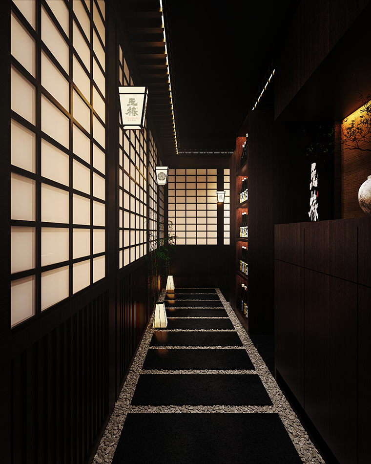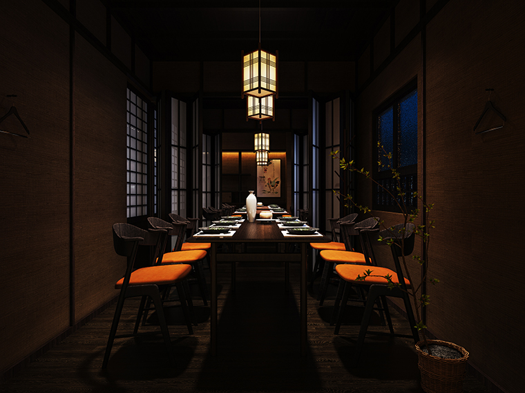 我們從門頭開始到天花吊頂、地面鋪設(shè)、墻面涂料、燈光、家具等各方面圍繞“京都味道、匠傳玉椿”來展開步移景異,一步一景的空間效果圖設(shè)計(jì)。
