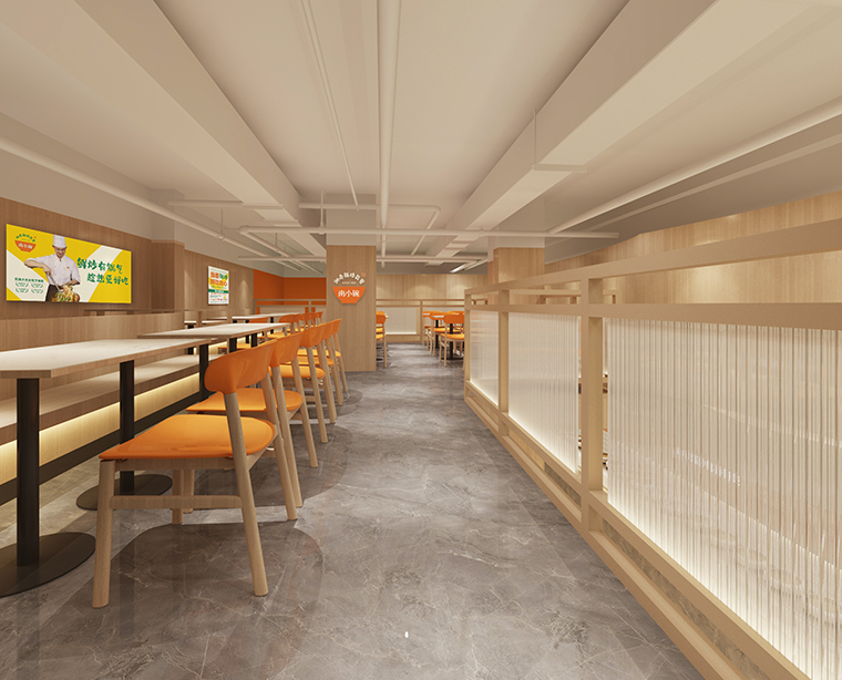 2、門口大面積落地玻璃、墻面使用板材,白色大理石臺面、灰色地面、木色桌面,橙色亞克力板。整個空間追求明亮、整潔、舒適的視覺感受。尤其是門口的落地玻璃,窗明幾凈,讓路過的消費者都能看見店內(nèi)熱火朝天的狀態(tài),鍋氣繚繞的煙火氣,產(chǎn)生強烈的進店沖動。