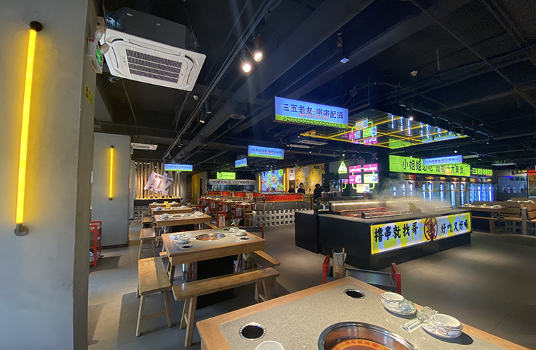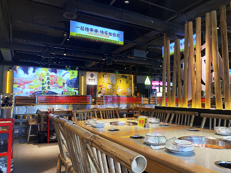 串串香火鍋的用餐特點比較獨特,類似自助火鍋。顧客自己到冰柜取串串,拿飲品,喜歡什么就拿什么。因此,在門店功能設計方面,取串串的冰柜是客流最密集的地方,需要給顧客展示出串串品類特別多的優勢。